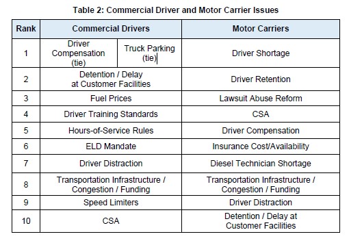 Drivers are very concerned about compensation, truck parking, and delays at customer facilities, all of which affect their bottom line directly. Motor Carriers are concerned about the driver shortage and retention; I have heard that about 90% of drivers leave their current job within the first two years.