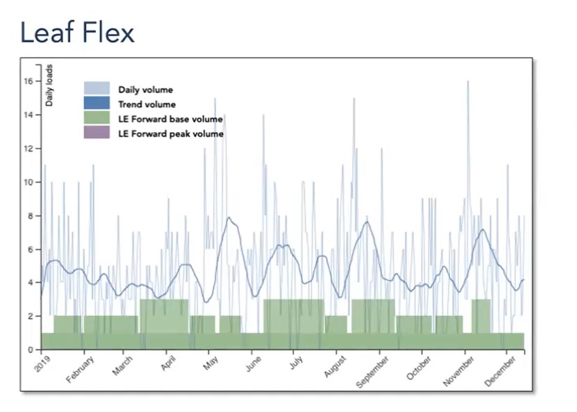 Leaf Logistics, an innovative truckload freight platform, has a unique recipe for reducing unloaded miles and matching carriers with driver-friendly routes, called Flex Fleets. It coordinates truckload freight between shippers and logistics service providers (LSPs) like trucking firms and freight brokers. The concept is that LSPs act as dedicated carriers over a short time for packages of loads from different shippers, but on approximately the same route. The claim is that users can experience a 75% or more reduction in slack or empty travel time for trucks.