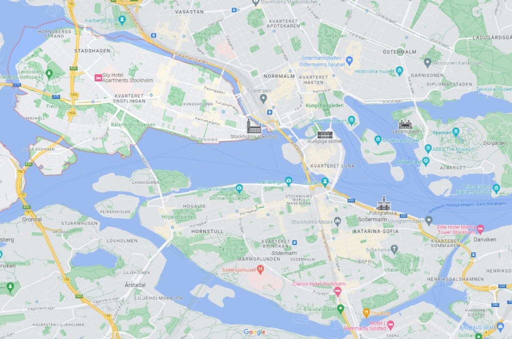 Stockholm has many islands. Kungsholmen is central to the city, and is where the city hall (Stockholms stadshus) is located. Sodermalm is a neighboring island, just to the south. The distance traversed is not large, but an autonomous ferry will make it convenient to travel between the islands. There are bridges, but the ferry provides a walkable alternative.