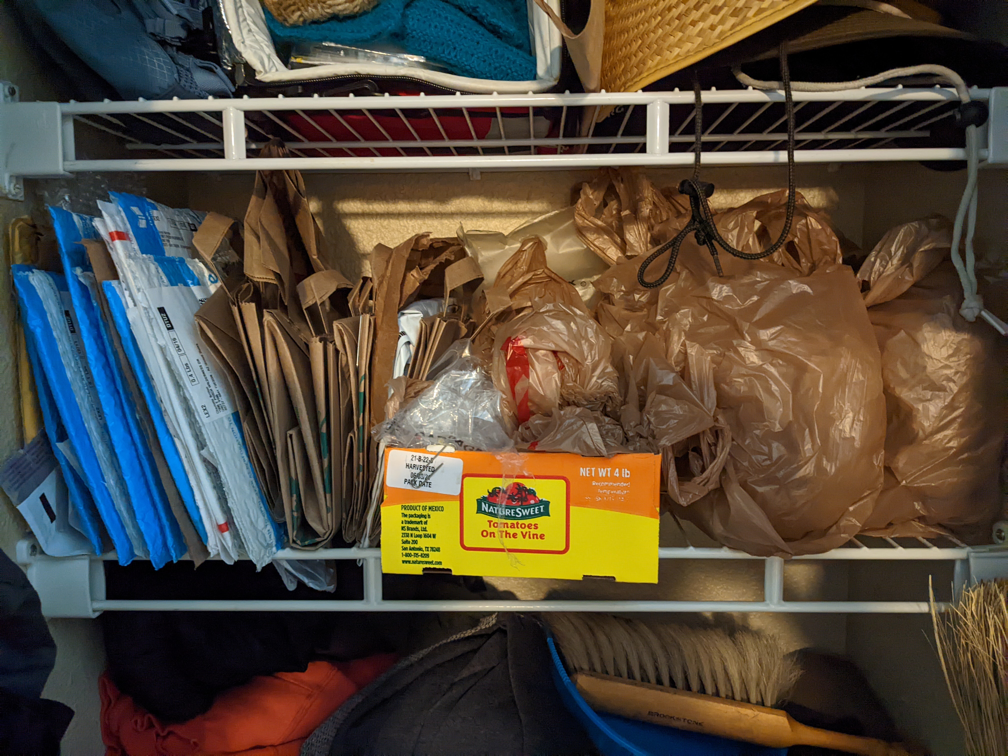 In freight transport, backhauls are always a problem. They are basically unpaid miles and tons. Their cost must be recovered in the head haul freight cost. It’s like the packaging when you buy something online. We either have to find something to do with it, or throw it away, or take up valuable space storing it for reuse. Here’s an entire shelf in my coat closet, stuffed with packaging.
