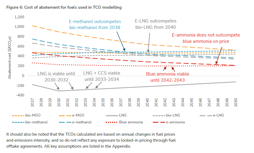 This figure from the report indicates when different fuel choices become cheapest in terms of abatement cost. It seems that e-ammonia never outcompetes blue ammonia before 2050. And LNG remains viable for quite a while, especially with integrated carbon capture.