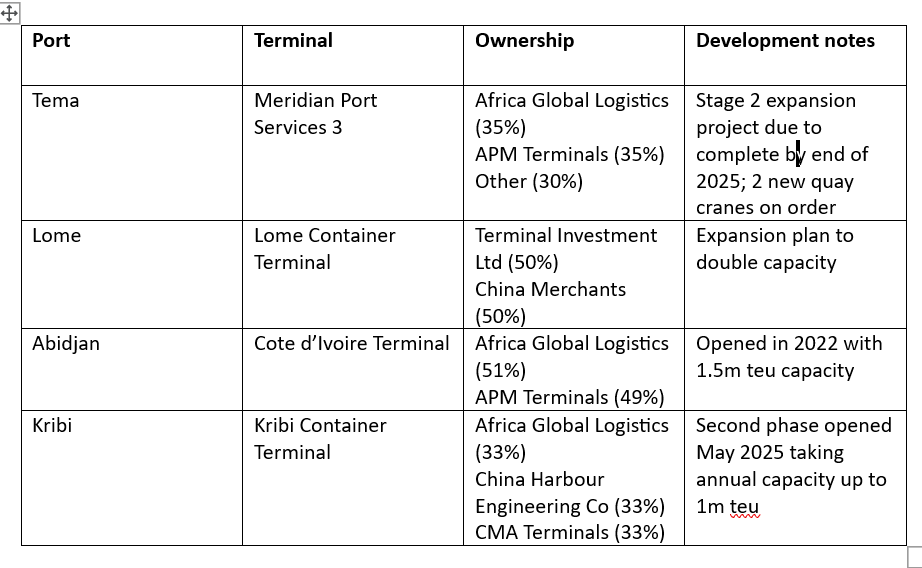 MSC is a major player in this trade. Their situation is helped by the fact that MSC has partial interests in port terminals in key West African locations, as the table below from the article shows. Tema is located in Ghana, Lome in Nigeria, Abidjan in Cote d’Ivoire, and Kribi in Cameroon. MSC has investments in Africa Global Logistics, which operates terminals at three of these ports; and a share in TIL, which has a terminal in Lome.